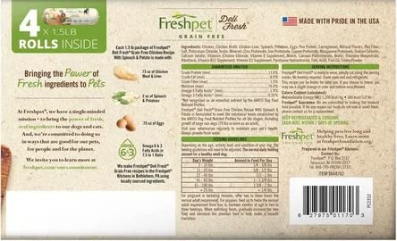 Freshpet Select Deli Fresh, Chicken Recipe with Spinach & Potato, Grain Free Rolls 4/1.5 lbs (Total 6 lbs)