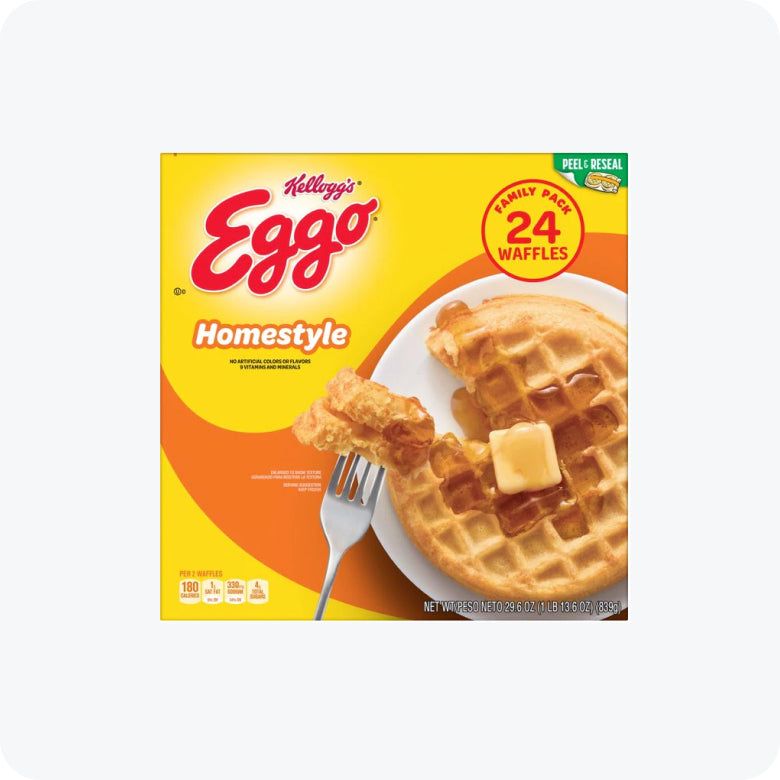 Kellogg's Eggo Homestyle Waffles. Wake up and greet the day with the feel-good taste of Kellogg's Eggo Homestyle Waffles. Deliciously crispy and fluffy, our Eggo Homestyle Waffles are crafted with delicious ingredients. Pop these frozen waffles in the toaster or oven for a delightfully crisp texture and the familiar, inviting taste of homemade waffles. These tasty frozen waffles are made with pantry-perfect staples; and every serving provides a good source of 9 vitamins and minerals. Conveniently packaged and easy to prepare, Kellogg's Eggo Homestyle Waffles help bring warmth and smiles to fast-paced, busy mornings. Includes one, 29.6-ounce box containing 24 waffles.