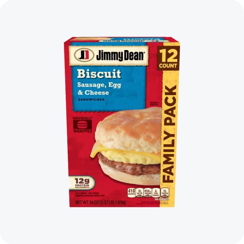 Greet the day with a warm sausage, egg and cheese biscuit sandwich. Featuring seasoned sausage, fluffy eggs and melty cheese on a golden baked biscuit made from scratch, Jimmy Dean Sausage, Egg & Cheese Biscuit Sandwiches make waking up in the morning the most delicious part of the day. Packed with 12 grams of protein per serving, these breakfast biscuits give you more fuel to power your morning and make a great family breakfast. Microwave and serve for breakfast at home or on the go for delicious and easy sausage biscuits. Comes with egg, frozen cheese and frozen sausage patties. Includes 12 individually wrapped frozen biscuits. Jimmy Dean once said, "Sausage is a great deal like life. You get out of it what you put in." That pretty much sums up his magic formula for having a great day. The Jimmy Dean brand brings you many ways to add some sunshine to your morning, because today's your day to shine on.