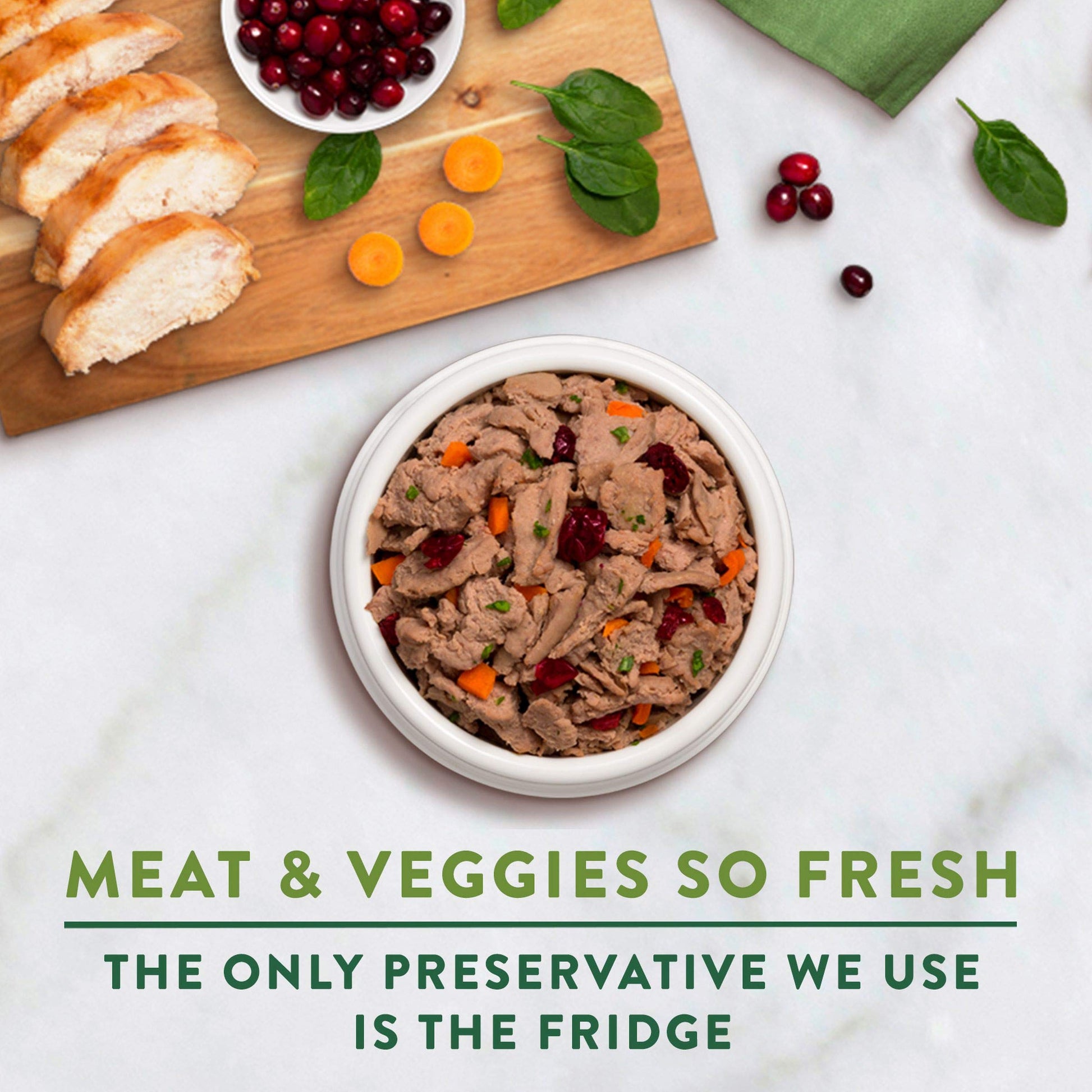 Fresh from our Kitchens with locally sourced shredded chicken and essential vitamins from carrots, spinach, and antioxidant rich cranberries. Now you can easily provide the love of a homemade, high protein, fresh meal to your dog in a convenient resealable bag.
