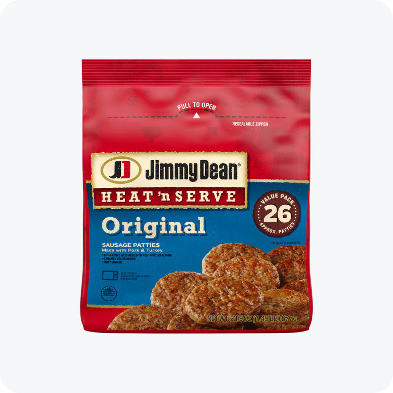 Brighten up your morning with these easy-to-prepare sausage patties. Made with quality pork, seasoned to perfection with our signature blend of spices, Jimmy Dean® Heat 'N Serve Pork Sausage Patties have 8 grams of protein per serving to give you more fuel to power your day. Simple to prepare and ready in minutes, just microwave and serve with eggs and toast for a traditional breakfast or with biscuits and gravy for brunch. Includes one package of 26 patties. Jimmy Dean once said, "Sausage is a great deal like life. You get out of it what you put in." Which pretty much sums up his magic formula for having a great day. Today, Jimmy Dean® Brand brings you many ways to add some sunshine to your morning. Because today's your day to shine on™.